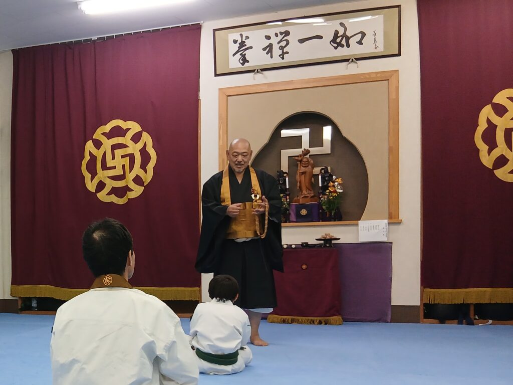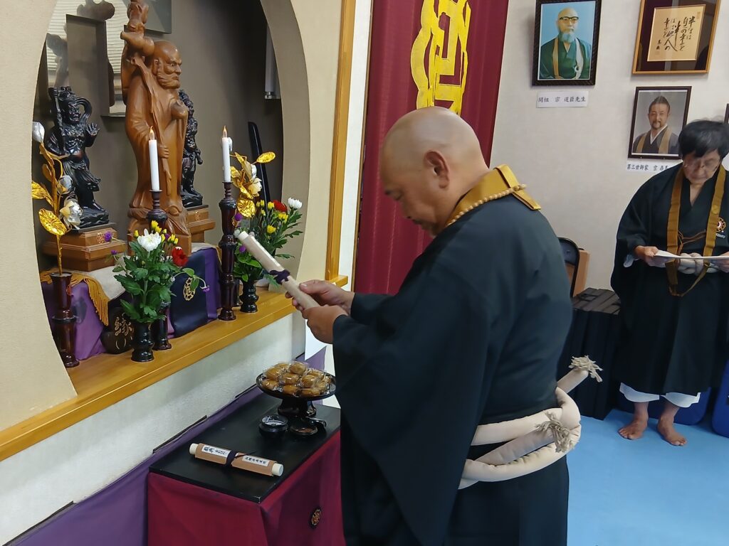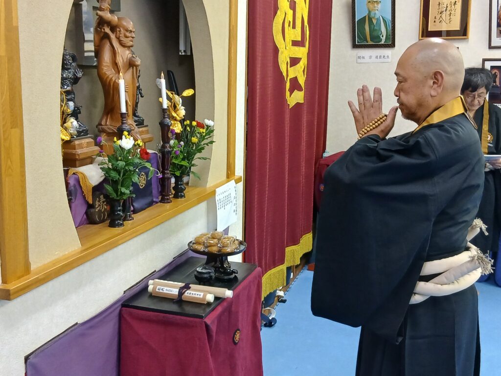 カテゴリー 儀式行事 達磨祭 投稿者 作成者: 近藤和彦 投稿日 2025年10月3日 達磨祭 へのコメントはまだありません 2025年10月3日 道院にて達磨祭をおこないました。 達磨祭とは達磨大師の命日とされている10月5日またはその前後に、祖師達磨大師を礼拝しその遺徳を偲び、さらに修行に精進することをお互いに誓いあう儀式です。 ← 入門式 → 今日の道院長 コメントを残す コメントをキャンセルメールアドレスが公開されることはありません。 ※ が付いている欄は必須項目ですコメント ※ 名前 ※ メール ※ サイト 次回のコメントで使用するためブラウザーに自分の名前、メールアドレス、サイトを保存する。 上に表示された文字を入力してください。